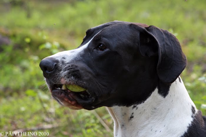 Toisella esineellä olinkin jo tarkkaavaisempi, Sebu lähti jäljestämäänkin ensimmäiseltä esineeltä paremmin. Huomasin koiran merkkaavan esineen ja sain palkattua hyvin. Jatkoimme jälleen matkaa ja matkanvarrella oli joltain aikaisemmin tippunut naru tms. jonka Sebu myös merkkasi :) Mutta, koska ohjaaja on tyhmä eikä hoksottimet ole kohdallaan, jäi tämä merkkaaminen multa huomoitta eikä kehunut koiraa :(. Onneksi Sebu ei tästä mieltään pahoittanut vaan paransi jäljestystä kuin sika juoksuaan. Viimeiselle palkalle mentiin hienosti ja hallitusti - sieltä palkkana tosiaan löytyi pallo, joko on niin kiva lelu ettei siihen ruokaa tarvitse sekottaa.
